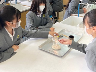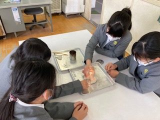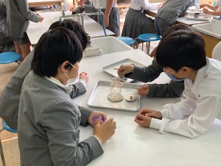 ねんどにろうそくを立てて上下の開いたびんをかぶせます。ふたをした場合と外した場合、ねんどを削って下にすき間を作ってふたをした場合と外した場合で、それぞれに火をつけてろうそくの火の燃え方がどうなるのか実験観察しました。線香の煙りも使って空気の動きも確認します。すぐに消えるのはなぜかな?よく燃えるのはどうしてかな?…6年生の子どもたちは気づいたことやわかったことをしっかりと発表することができていました。