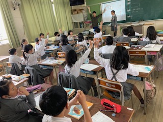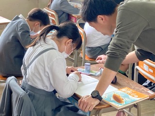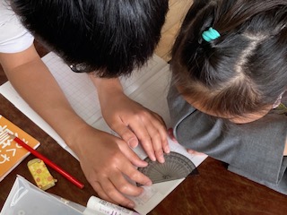 4年生の子どもたちが算数の授業で分度器を使って角の大きさをはかっていました。どうやってはかったらいいのかな、どの部分にどこを合わせたらいいのかな…、子どもたちはお互いに相談しながら学習を進めていました。先生もていねいに子どもたちを見て回ります。特に直角(90度)より大きい場合はめもりを読むときに気をつけないといけません。前に出て元気に発表する様子も見られました。