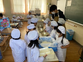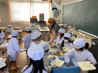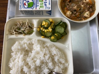 今日の給食のメニューは、麻婆豆腐、きゅうりとコーンの甘酢和え、もやしとピーマンのごま炒め、牛乳、ごはん、でした。麻婆豆腐は辛みを抑えて香り豊かに、子どもたちが食べやすいように仕上げています。きゅうりとコーンの甘酢和えは砂糖、塩、米酢で作ったドレッシングがかけられています。もやしとピーマンのごま炒めはごまの風味がしっかり感じられました。1年生の子どもたちが何ともう自分たちで給食の準備を進めています。しゃもじを使ってごはんを上手によそっている様子を見てびっくりしました。