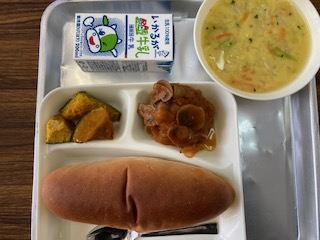 今日の給食のメニューは、煮込みハンバーグ、コーンとキャベツのスープ、焼きかぼちゃ、牛乳、パン、でした。煮込みハンバーグは思った以上に肉厚で、炒めたたまねぎとマッシュルームにケチャップ、ウスターソースで味つけしたソースでじっくりと煮込んでいます。コーンとキャベツのスープはコーンの甘さを生かしたスープで、子どもが大好きな味だと思います。焼きかぼちゃは塩で味つけしてから焼き物機で焼いています。