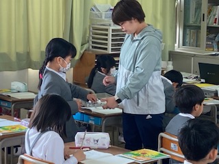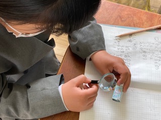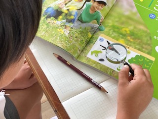 3年生から理科が始まりました。理科ってどんな学習なのかな。子どもたちは新しい理科の教科書をペラペラめくってみます。先生が虫めがねを配ってくれました。子どもたちは虫めがねを使って教科書の写真や自分の持ち物を細かく見ていきます。次の理科の時間には、外に出て自然や生き物の観察を虫めがねで行うそうです。子どもたちはそれを聞いて、わくわく、うれしそうな顔をしていました。