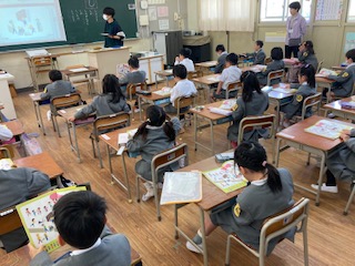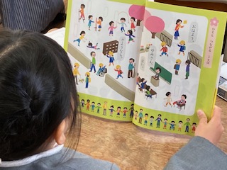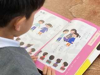 1年生の国語の学習です。ひととつながることば…。どんなことばかな。子どもたちは教科書の絵を見て、どんな場面か考えます。ありがとうって言っていると思う、かしてって言っていると思う、ごめんなさいって言っていると思う、いっしょにあそぼうって言っていると思う、またあしたねって言っていると思う…。たくさんの意見が出てきました。自分たちもひととつながることばがいっぱい言えるようになろうねと先生が話していました。