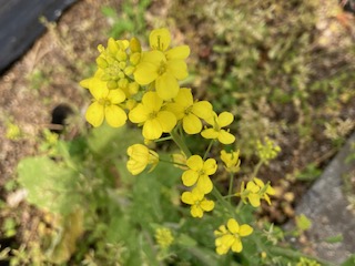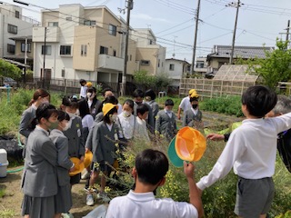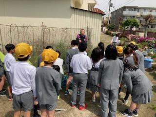 アブラナの花が咲いた後、実はどこにできるのだろうか。5年生の子どもたちは今、理科の授業で[花のつくり]を学習しています。学習園にアブラナの観察にやってきました。アブラナはつぼみから実まで一つの株なので変化がとらえやすいです。おしべ、めしべ、花びら、がく…、近くに顔を寄せて観察していきます。花が咲いた後、めしべのもとのふくらんだ部分が育ち実になって、その実の中には種子ができることを教えてもらいました。