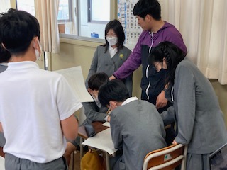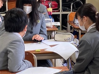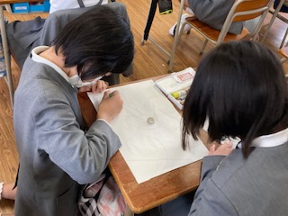 6年生の子どもたちがイメージ作りをしていました。図工の授業で[名前でアート]に取り組みます。自分の名前をひらがな、カタカナ、漢字、ローマ字などを使ってアートにします。大きく文字を変形したり、立体的に表したり、遠近感を出したり、色づかいによる効果など、いろいろな工夫を考えてアートにします。いきなり画用紙に下描きをするのは難しいので、まずはイメージ作りから始めていました。友だちと相談しながら、お互いにアイデアの交換をしていました。