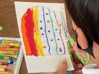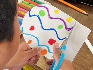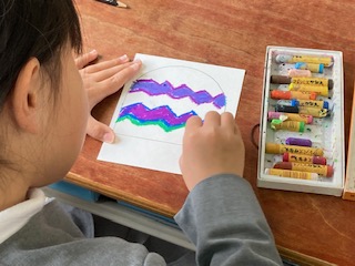 3年生の子どもたちが何やら作っています。よく見ても何を作っているのかわかりません。模様やデザインも一人一人違います。そしてはさみで切っていきます。まるい部分があるみたいです。