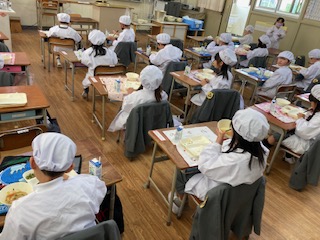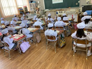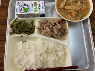 今日の給食のメニューは、豚肉の生姜焼き、みそ汁、じゃこピーマン、牛乳、ごはん、でした。豚肉の生姜焼きは下味がしっかりとついていて、ごはんとの相性もばっちりでした。みそ汁は具だくさんで野菜がたっぷり入っていました。じゃこピーマンはちりめんじゃことピーマンを油で炒めて、砂糖、料理酒、しょうゆで味つけしています。ピーマンは鼻を丈夫にするカロテンや風邪を防ぐビタミンCを多く含む野菜です。1年生の子どもたちもしっかりとピーマンを食べていました。