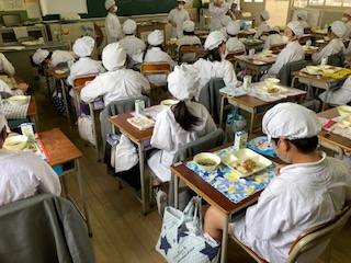 今日の給食のメニューは、ビビンバ、トックスープ、牛乳、でした。ビビンバは香りよく炒めた牛豚ひき肉ときゅうり、にんじん、切り干し大根を使っていて、しっかりとコチジャンとごま油の風味が効いていました。トックスープは韓国・朝鮮のもちが入ったスープで、青みに小松菜を使っています。