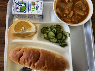 今日の給食のメニューは、ビーフシチュー、きゅうりのサラダ、甘夏かん、牛乳、パン、でした。ビーフシチューはルウから手づくりしていて、牛肉の旨味が活かされた濃厚で深い味わいのシチューでした。きゅうりのサラダはワインビネガーのほんのり酸味の効いたドレッシングがかけられていてさっぱりとした味わいでした。甘夏かんは果汁が多く自然の甘さが感じられました。