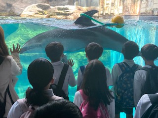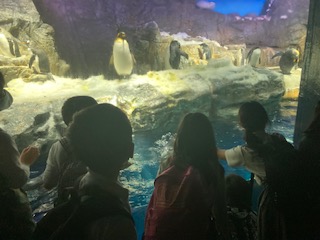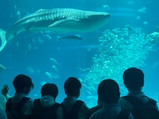 たくさんの展示槽や大水槽にいろいろな種類の魚や生き物たちが泳いでいます。ペンギンやイルカに子どもたちは走り寄っていきます。かわいい、すごーい、楽しそうな子どもたちの声。海遊館と言えば、やっぱりジンベイザメですよね。その大きさと優雅に泳ぐ姿に、子どもたちも感動している様子です。まだまだしっかりと見学を続けます。