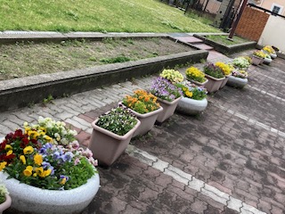 行楽地は久々に観光客が増えて、高速道路は渋滞の列が続いたというニュースが流れていましたが、みなさん、ゴールデンウィークはゆっくりできましたでしょうか。ゴールデンウィークが終わって、子どもたちも元気に登校してきました。新緑がまぶしい5月、学校の方も仕切り直して、気持ちを切り替えて、教育活動に取り組んでいきたいと思います。引き続き、ご理解ご協力をお願いします。昨日の雨で芝生広場のシロツメクサも一気に増えました。プランターの花もいきいきとしています。
