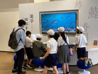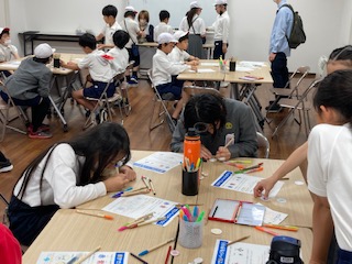 展示コーナーや体験コーナーを満喫しながら、同時進行でクラス毎に分かれてワークショップにも取り組みました。缶バッジ作りです。一人2文字の好きな漢字を選んで缶バッジにすることができます。どの字にしようかと子どもたちは悩みながら、カラーリングにも工夫していました。