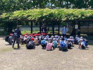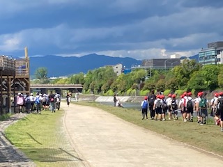 円山公園で少し遊びました。木陰でおしゃべりしたり鬼ごっこをしたり…。その後、みんなで鴨川沿いを歩きました。川床が設営してあり、食事をしている人が手を振ってくれました。京都の代表的な八坂神社や鴨川を散策することができてよかったです。いっぱい活動できました。子どもたちは少しお疲れの様子です。では電車に乗って帰りまーす。