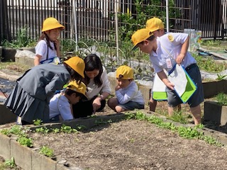 ダンゴムシ、アリ、ちょうちょ、きれいな花の形や色、変わった形の石…、国語の授業で[みんなに話そう]という学習です。子どもたちが走り回っている姿がとてもかわいらしいです。