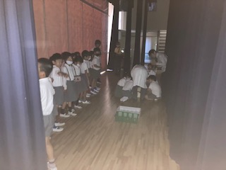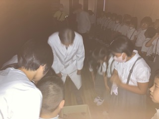 3年生の子どもたちがホタルの幼虫の観察を行いました。毎年恒例の行事で、地域のいつもお世話になっている方にお願いしています。ホタルの生態について教えていただいたり、成長したホタルを放す体験をさせていただいたりしています。幼虫も光るんだよ…、その言葉に子どもたちも興味深々。実際に講堂の舞台で見せてもらいました。写真はフラッシュをしていますが舞台の中は真っ暗です。