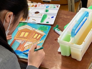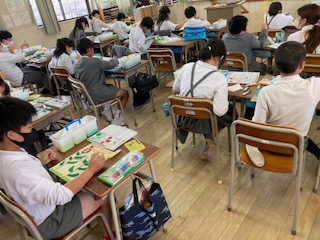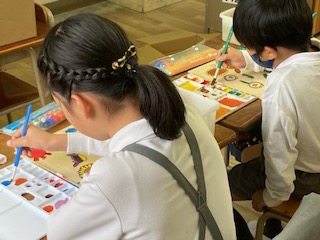 5年生の子どもたちが図工の授業で木の板に描いた下描きの絵にえのぐで色をぬっていました。一人一人ちがった絵でにぎやかです。何を作っているのか尋ねてみると、パズルづくりをしているとのことです。絵が完成したら、次は、図工室にある電動糸のこぎりでガガガガガっと裁断してパズルにしていくようです。上手にできるといいですね。できたら遊ばせてもらいましょう。