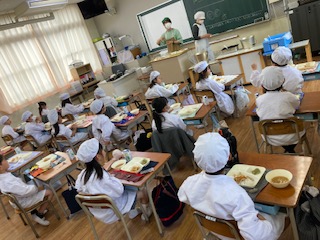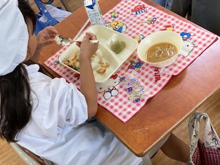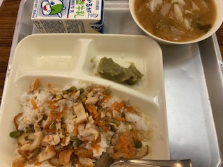 今日の給食のメニューは、かやくごはん、みそ汁、抹茶ういろう、牛乳、でした。かやくごはんは鶏肉、ちくわ、にんじん、さんどまめを具材に濃いめの味つけでおいしかったです。みそ汁はだしがしっかりととられていて、じゃがいもが入っていました。抹茶ういろうはもちもちしていて抹茶の香りが楽しめました。