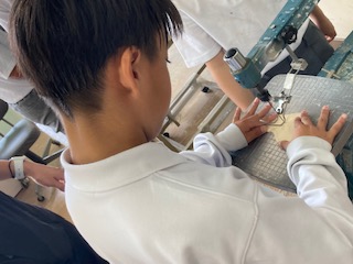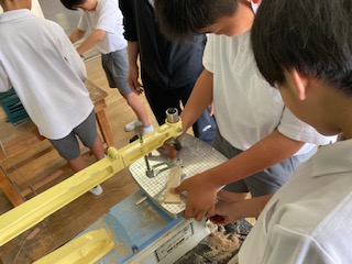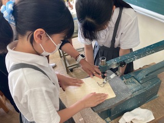 図工室からガガガガと大きな音が聞こえてきます。5年生の子どもたちが電動糸のこぎりを使って板を切っていました。機械は結構振動するので、しっかりと板を押さえながら、刃を折らないようにゆっくりゆっくり切っていかないといけません。はじめは子どもたちも少し恐る恐るといった様子でしたが、だんだん慣れてくると動きもスムーズになってきました。安全に気をつけて頑張ってくださいね。