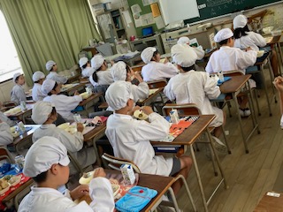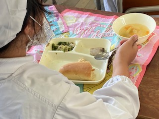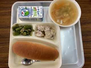 今日の給食のメニューは、かつおのマリネ焼き、スープ、グリーンアスパラガスのソテー、牛乳、パン、でした。かつおのマリネ焼きは塩こしょうとノンエッグドレッシングで下味をつけて風味よく焼いています。スープはチキンブイヨンをベースに鶏肉で旨みを出し、じゃがいも、たまねぎ、にんじん、グリンピースを使った彩りのよいスープでした。グリーンアスパラガスのソテーは旬のアスパラガスとベーコンを炒めたシンプルなものですが季節感が感じられました。