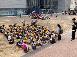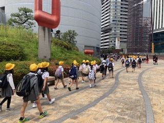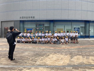 今日は4年生の子どもたちが大阪市立科学館に社会見学に来ています。交通ルールや電車でのマナーをよく守って、とてもお利口さんな子どもたちです。到着したら、まずは各クラスで写真を撮りました。ハイ チーズ!