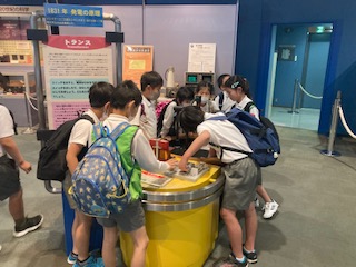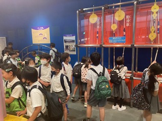 館内にはたくさんの科学にまつわる体験コーナーや展示物があります。子どもたちは興味関心をもって体験したり説明文を読んだりしています。科学の不思議…、普段の学校の座学では見られないような横顔を見ることもできました。みんな、とっても楽しんでいます。