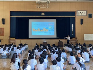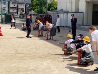 2時間目は各学年の実態に合わせた内容で防災学習を行いました。東淀川区役所や東淀川消防署と連携しています。ビデオによる学習(1年)、消防車の紹介や隊員の仕事、水消火器体験(2.3年)実際の映像を交えた地震や津波の恐ろしさ、自らの取るべき行動(4.5.6年)など多岐にわたっています。子どもたちは真剣な表情で説明を聞いていました。