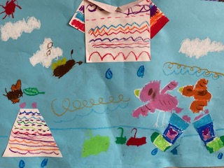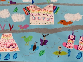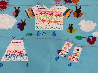 1年生の教室の後ろに青空が広がっています。テーマは[おしゃれなシャツ]です。いろいろな色の線を使って模様を描いています。シャツやくつ下が洗濯ばさみにはさまれて青空の下で干してあります。風にふかれてゆらゆら洗濯物が揺れています。教室の中がとてもさわやかな感じになりました。