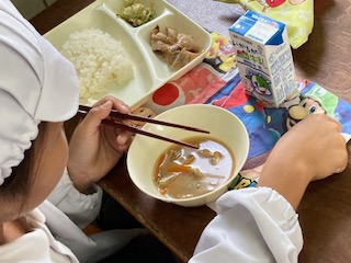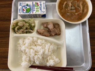 今日の給食のメニューは、鶏肉のしょうゆバター焼き、みそ汁、野菜炒め、牛乳、ごはん、でした。鶏肉のしょうゆバター焼きは、料理酒としょうゆで下味をつけた鶏肉に溶かしバターをかけて風味よく焼き上げています。みそ汁はうすあげ、たまねぎ、にんじん、オクラ、えのきたけを使っています。野菜炒めはツナとキャベツ、ピーマンを油で炒めて、塩こしょう、しょうゆで味つけしています。シンプルですが、とてもおいしかったです。