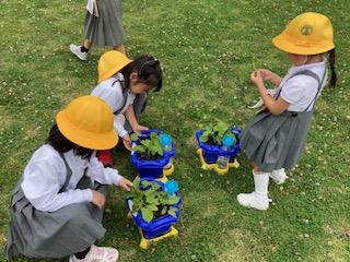 1年生の子どもたちがアサガオの間引きをしていました。双葉が開いて本葉が茂ってきたので、間引きをすることにしました。苗が混み合っていると生育が悪くなるからです。間引きをした後には水やりをします。もうすぐつるがのひてくるので、支柱を立てないといけませんね。子どもたちは[せんせー、これでいいのー?、これであってるのー?]と何回も植木鉢を持って先生のところに行っては尋ねている姿がかわいらしかったです。