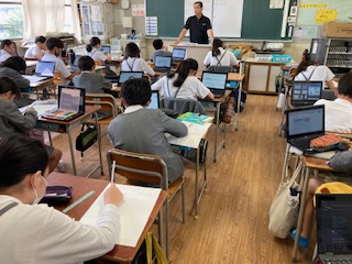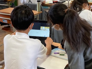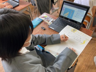 6年生の子どもたちが一人一台PCを使って新聞づくりをしていました。調べた内容や記事を自分なりにプリントにまとめていきます。テーマは、災害(地震)です。ちょうど先日の土曜授業では安全防災学習をしました。その際に区役所の方から地震や津波について教えてもらったので、その発展学習です。レイアウトを考えて見やすさやわかりやすさなども工夫しながら作成に取り組んでいました。