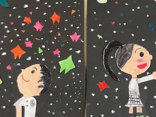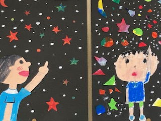 4年生の子どもたちが色とりどりのきらめく星たちを見上げています。きれいだなぁー。先日、科学館のプラネタリウムを見た体験を活かして作ったそうです。プラネタリウムではたくさんの輝く星が映し出されて、子どもたちは感嘆の声を上げていました。そのときの表情とこの絵の表情はきっと一緒なんでしょうね。