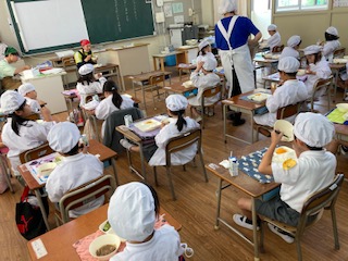 今日の給食のメニューは、すき焼き煮、きゅうりの生姜づけ、オレンジ、牛乳、ごはん、でした。すき焼きには牛肉の旨みとしっかりとした味つけで、ごはんが進みました。きゅうりの生姜づけは生姜汁、砂糖、薄口しょうゆで作った調味液につけ十分に味を含ませています。オレンジは果汁が多く、自然の甘さが感じられました。