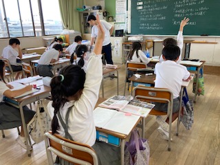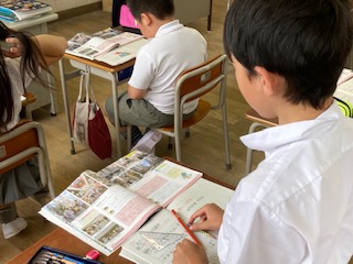 3年生の子どもたちが社会の授業で商店街について調べていました。大阪市には大きな商店街がいくつもあります。大きな商店街には多くの品ぞろえの豊富なお店や飲食店が集まっています。地域の人たちをはじめ、買い物客や観光客で大変賑わっています。また梅田や難波、天王寺などにはデパートや地下街があります。今、子どもたちは大阪市の街の様子について学習しているところです。[知ってる!][行ったことある!]と子どもたちも口々に自分の体験を話していました。