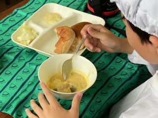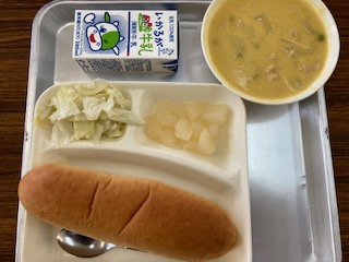 今日の給食のメニューは、かぼちゃのクリームシチュー、キャベツのゆずドレッシング、和なし(カット缶)、牛乳、パン、でした。かぼちゃのクリームシチューはかぼちゃの自然の甘さが際立ち、口あたりもまろやかでおいしかったです。キャベツのゆずドレッシングはゆず風味の手作りドレッシングがかかっていて、さっぱりとした味わいでした。給食の和なし(カット缶)は幸水・豊水・二十世紀などの日本なしを使用しています。