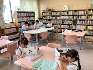 1年生の子どもたちが図書室で本を読んでいました。小学校の図書室にはたくさんの本があります。子どもたちはその中から自分の読みたい本を探すのに一苦労です。それでも楽しそうに探しています。一人で読んだり、みんなで読んだり、そしてお友だちと紙しばいをしたり…、おだやかなひとときが図書室に流れていました。本が大好きな子どもになってくださいね。