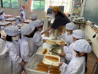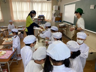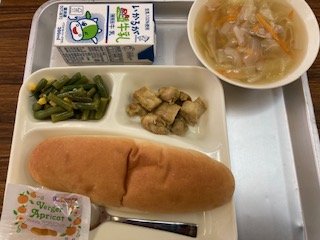 今日の給食のメニューは、鶏肉のカレー風味焼き、てぼ豆のスープ、さんど豆とコーンのサラダ、牛乳、ごはん、でした。鶏肉のカレー風味焼きは鶏肉にガーリックやカレー粉などで下味をつけて香り豊かに焼き上げています。てぼ豆のスープはチキンスープをベースに塩こしょう、しょうゆで味をととのえてありコクが感じられました。てぼ豆は[白いんげん]とも呼ばれ、たんぱく質や炭水化物、骨や歯を丈夫にするカルシウム、お腹の調子を整える食物繊維などが多く含まれています。さんど豆とコーンのサラダはさんど豆の緑があざやかで、コーンの甘さがアクセントになっていました。