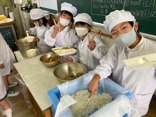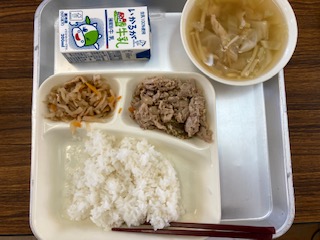 今日の給食のメニューは、豚肉のごまみそ焼き、すまし汁、切干し大根の炒め煮、牛乳、ごはん、でした。豚肉のごまみそ焼きは豚肉にねりごま、赤みそなどで下味をつけ、たまねぎとピーマンを混ぜ合わせて、いりごまをふって焼いています。とても風味豊かで、ごはんともよく合いました。すまし汁はだしがしっかりととられていて、鶏肉とたけのこ、キャベツ、えのきが入っていました。切干し大根の炒め煮は味がしっかりと染みていておいしかったです。