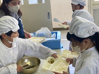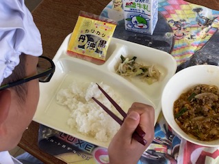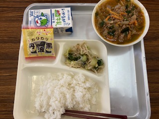 今日の給食のメニューは、麻婆春雨、チンゲンサイともやしの甘酢和え、いり黒豆、牛乳、ごはん、でした。麻婆春雨は牛豚ひき肉で旨みを増し、トウバンジャンで少し辛味をきかせた味つけにしていて、ごはんがすすみます。春雨にも味がしみていました。チンゲンサイともやしの甘酢和えは彩りもあざやかで、さっぱりとした口あたりでした。いり黒豆は一人一袋です。