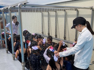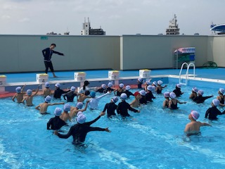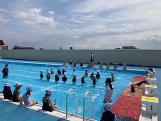 2時間目に1年生の子どもたちがはじめて小学校のプールに入りました。屋上のプールを見た瞬間、[うわー][大きいー]と驚きの声があがりました。今日はいろいろと覚えることがありました。並び方やシャワーの浴び方、準備運動やプールへの入り方と上がり方、タオルのふき方など、そしてプールでのきまり…。これから1年生も安全に楽しい水泳学習を進めていってほしいと思います。今日はディズニー体操もしました。ディズニーの音楽に合わせて、先生のまねをしながら楽しく踊りました。
