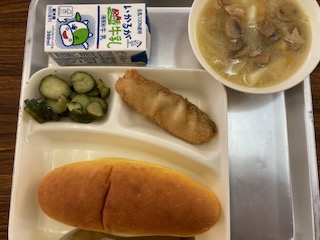 今日の給食のメニューは、サーモンフライ、豆乳スープ、きゅうりのバジル風味サラダ、牛乳、パン、でした。サーモンフライはころもがサクッと揚げられていて、味もしっかりとついていました。豆乳スープはベーコンで旨みを出し、じゃがいも、たまねぎ、にんじん、コーン、パセリ、マッシュルームを使用した、豆乳のまろやかさを生かしたスープです。きゅうりのバジル風味サラダは蒸したきゅうりをバジルを使った手作りのドレッシングで和えています。