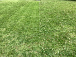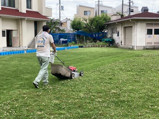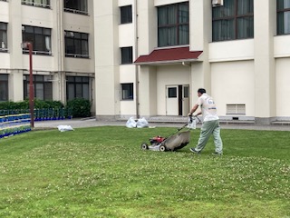 子どもたちが大好きな芝生広場、いつも走り回って遊んでいる芝生広場、安らぎとみんなの憩いの場になっている芝生広場、青々と茂った緑がとてもさわやかな雰囲気を与えてくれる大道南小学校の自慢の芝生広場です。でも特に夏場はシロツメクサもすぐに生えてきて定期的なメンテナンスが必要になってきます。本校の管理作業員さんが計画的に伸びた芝や雑草などを刈ってくれています。いつも一人で、時間もかかります。それに結構、重労働です。おかげで子どもたちは気持ちよく過ごせます。刈った後と刈る前の境目がくっきりとしているのがわかるでしょうか。