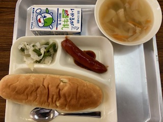 今日の給食のメニューは、ウインナーのケチャップソース、スープ、キャベツとさんど豆のサラダ、牛乳、パン、でした。ウインナーのケチャップソースは皮がパリッとはじけて、ウインナーの脂がしみ出る感じでおいしかったです。スープはチキンスープをベースに鶏肉で旨みを出し、じゃがいも、たまねぎ、にんじん、グリンピースが入っていて彩りもよかったです。キャベツとさんど豆のサラダはほんのり酸味をきかせたさっぱり味でした。