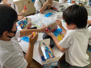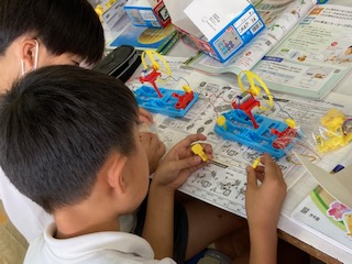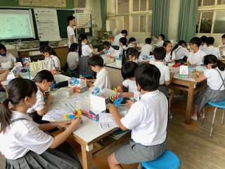 4年生の子どもたちが理科室で実験をしていました。乾電池のはたらきについて調べていました。今日の学習は、乾電池をつなぐ向きとモーターの回る向きにはどんな関係があるか、です。子どもたちは一人一人設計図を見ながら、実験に使う回路を作って調べていました。こういう教材があると、子どもたちはほんとに夢中になりますよね。あーだこーだ言いながら楽しんでいました。