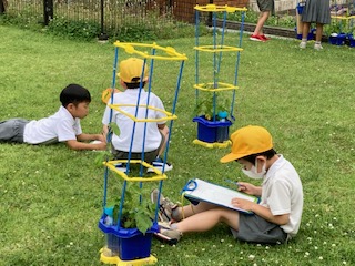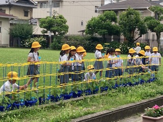 1年生の子どもたちが育てて観察を続けているアサガオにつぼみを見つけました。まだほとんどの子たちのアサガオはつぼみのそのまたつぼみのような状態ですが、気の早いアサガオもいました。つるがくるくると支柱に巻き付いている様子も子どもたちはお気に入りのようです。子どもたちは観察シートにうれしそうに絵を描いていました。