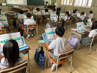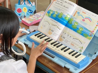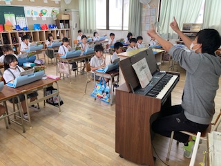 2年生の子どもたちの元気な鍵盤ハーモニカが教室から聞こえてきました。[かえるのがっしょう]です。音の高さに気をつけながら鍵盤ハーモニカでおいかけっこをしていました。吹き口から息を吹き込み、子どもたちの小さな指がしっかりと鍵盤を押さえて、きれいな音色を奏でていました。