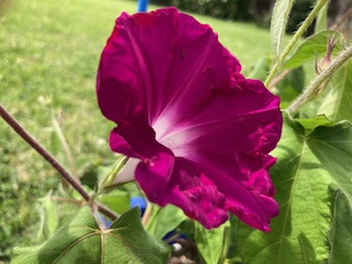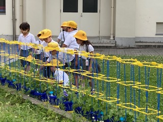 1年生の子どもたちが種を植えて、毎日忘れずに水やりを続けていたあさがおの花が咲きはじめました。あかむらさきとむらさきのあさがおです。これから毎日観察するのが楽しみになりますね。明日は誰のあさがおが咲くのかな。さらにいっぱい水やりをする1年生の子どもたちです。
