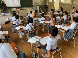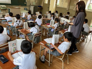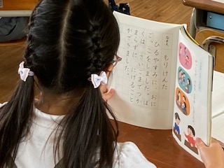 1年生の子どもたちがはじめての文章作りです。本を読んだり進んで話したりすることができる1年生の子どもたちですが、自分で考えて文章を書くことはまだまだむずかしいところがあります。学年が上がるごとに上達していきますが、1年生では基本中の基本を学びます。先生と一緒に頑張ってお勉強しましょうね。