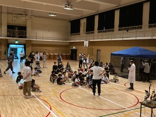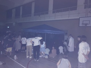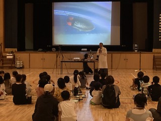 本日19時より3年生の子どもたちが集まって(自由参加)、講堂でホタルの夕べを開きました。本校の特色の一つとして、十数年以上も前から3年生においてホタルの幼虫の観察や生態の学習、成虫になったホタルを放すといった取組を行っています。これは地域に住むホタル博士Nさんのご厚意によるものです。今日は春にホタルの幼虫を観察した時の感想を交流したり、顕微鏡を通してスクリーンに映したホタルの様子を観察したりしました。そのあとテントで作った蚊帳の中にホタルの成虫を放し、光りながら飛んでいる様子を直接観察しました。ホタルの光を見た子どもたちは[光ってる!光ってる!]と感嘆の声をあげていました。ホタルはきれいな澄んだ水が流れる自然に行かないと見られないと言われますが、子どもたちはホタルが神秘的な光を放ちながら飛んでいる様子を見ることができて、とても喜んでいました。