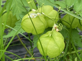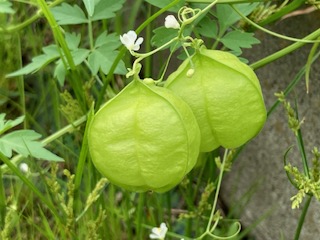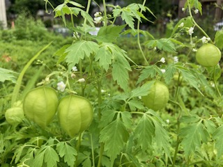 学習園で[ほおずき]を見つけました。育ててはいないので、おそらく自生しているものだと思います。ほおずきは提灯のような姿から和風なイメージがありますが、原産地は南アメリカだそうです。ほおずきの花は白色で、小さくしとやかに咲いている感じです。写真にもよく見ると確認できます。ほおずきは花が咲き終わると、がくの部分が大きくなり、果実を包み込むように袋状になっていきます。これから夏の終わりや初秋にかけて赤色やオレンジ色に染まっていきます。それにしても植物にはいろいろな種類や形がありますね。不思議ですね。