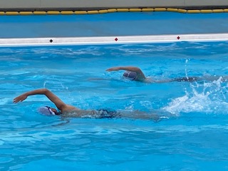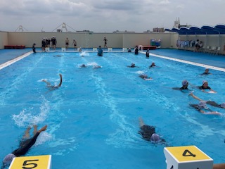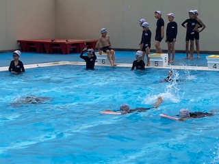 空を見上げると少し雲がありますが気温は高く、今日も絶好のプール日和です。5年生の子どもたちが水しぶきをあげながら、今日も元気に泳いでいます。自分の体力や泳ぎを判断して、コース別に分かれて練習です。どんどん泳ぎたい子、息つぎを中心に練習したい子、泳ぎのフォームを確認したい子、バタ足に注目したい子など、一人一人それぞれが目標をもって取り組んでいました。なかなか一人一人に個別の水泳指導をするのは手が足らずむずかしい面もあるので、子どもたち自身が自分の目標をもって練習することはとても大切なことですね。