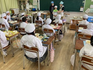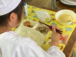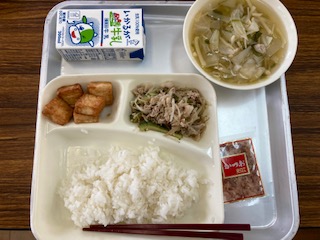 今日の給食のメニューは、ゴーヤチャンプルー、五目汁、厚揚げの生姜醤油かけ、牛乳、ごはん、でした。ゴーヤ(にがうり)は夏が旬の野菜です。配膳が終わったら、今日の日直さんが前に出てきて、今日の給食のメニューを一品ずつ紹介していきます。今日の給食は・・・・です。そして最後に[全部ありますか?]とみんなにたずねます。するとみんなは声をそろえて[はい、あります!]と答えます。そして日直さんが[手を合わせて、いただきます]と言うと、さあ楽しい給食のはじまりです。おいしく召し上がってくださいな。